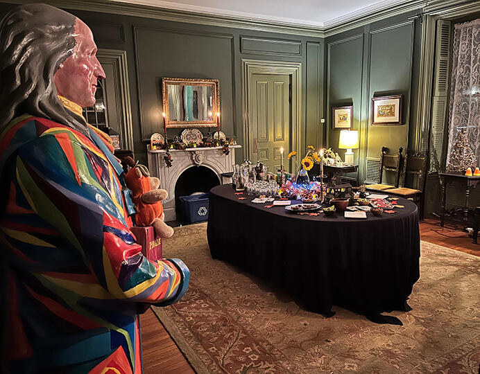 We have a pretty decent upright piano, a soon-to-be tuned handcrafted harpsichord, a good PA system, a marble fireplace, a trompe l'oeil ceiling, and a lot of twinklights.